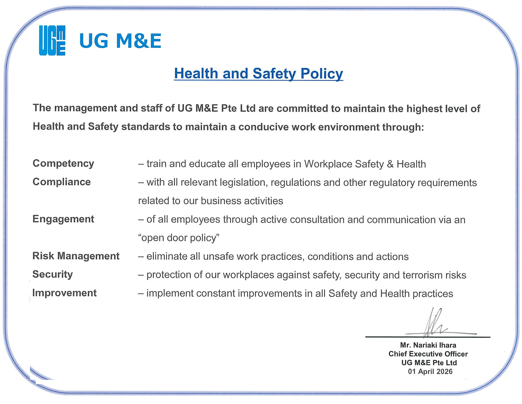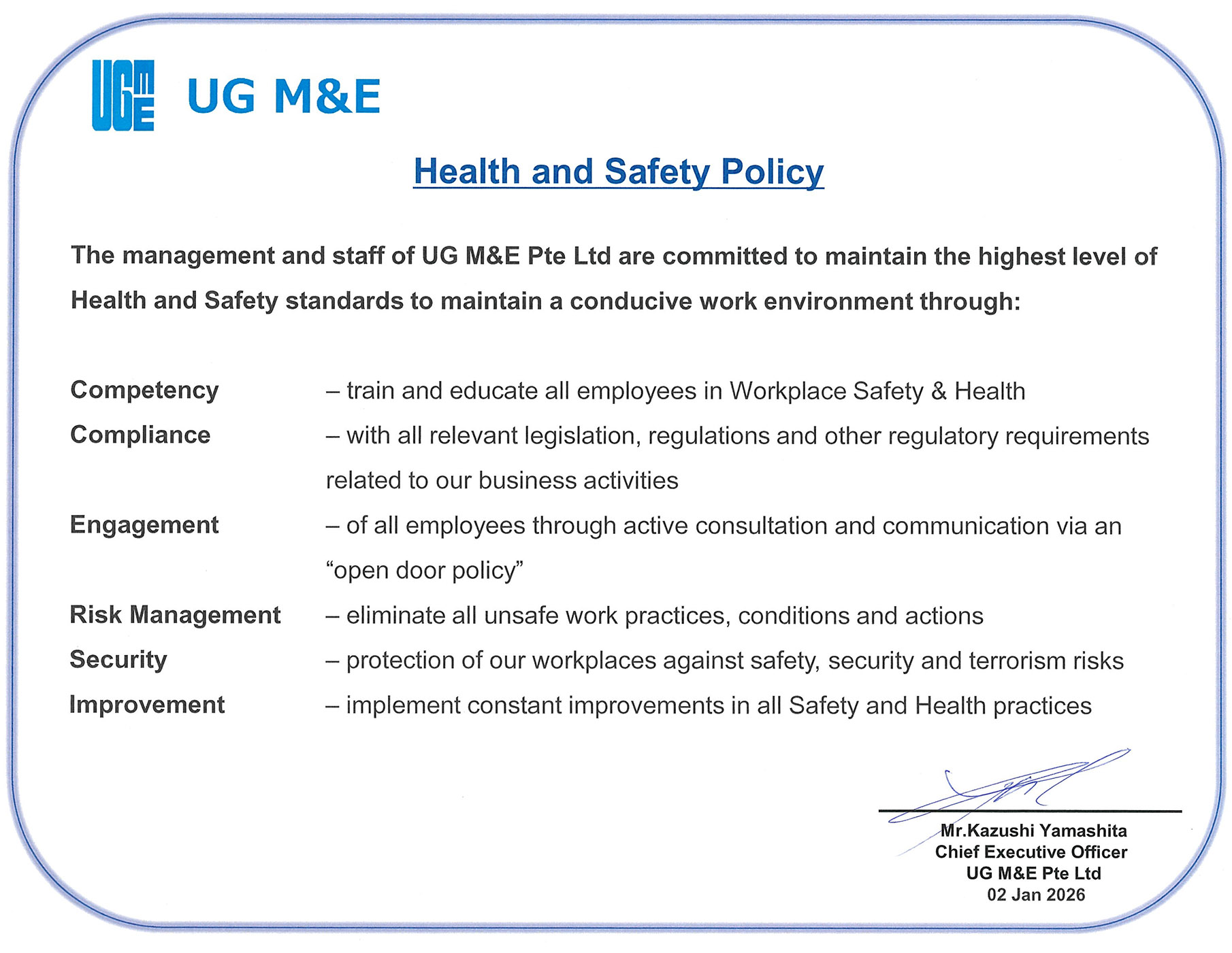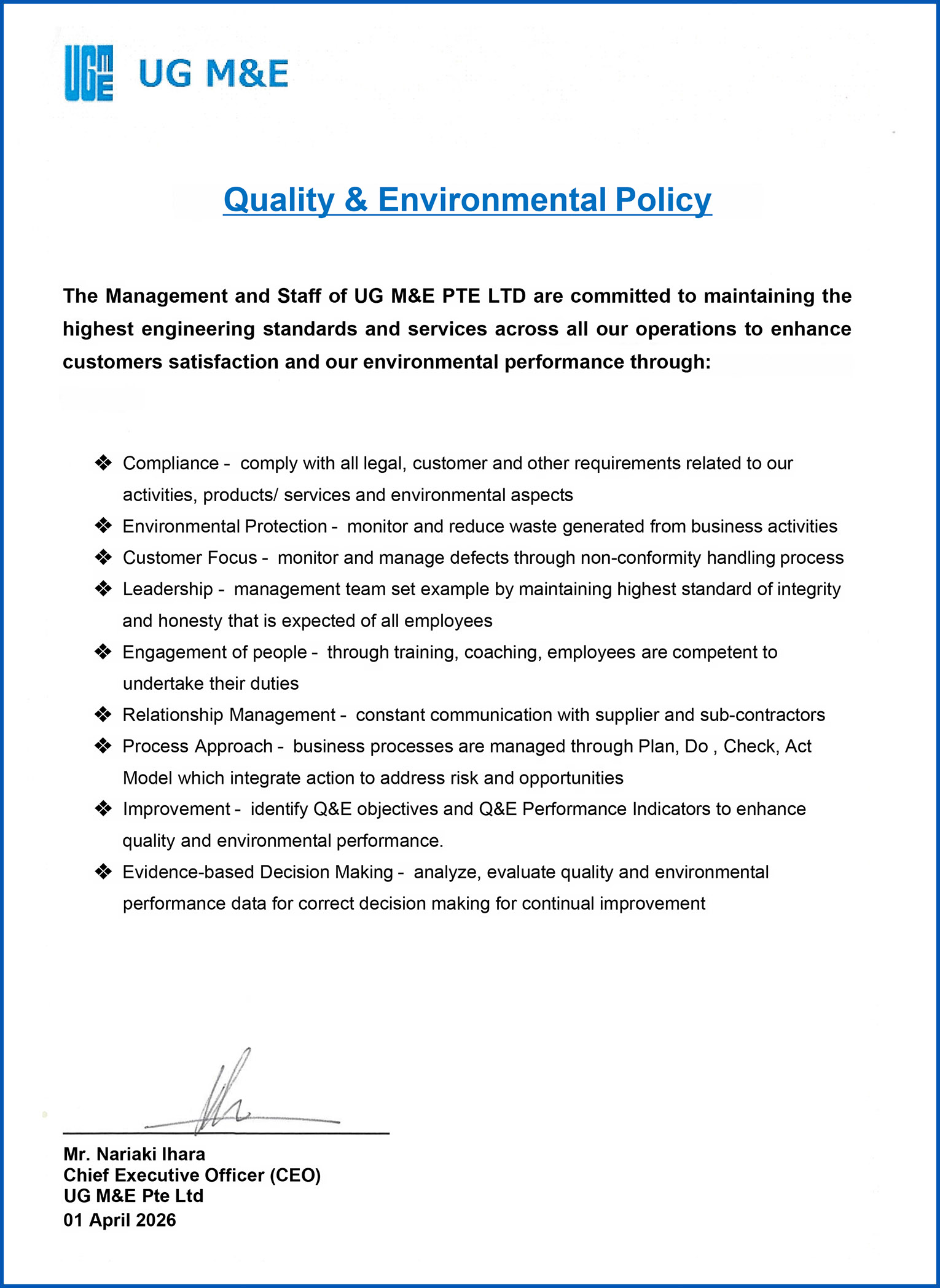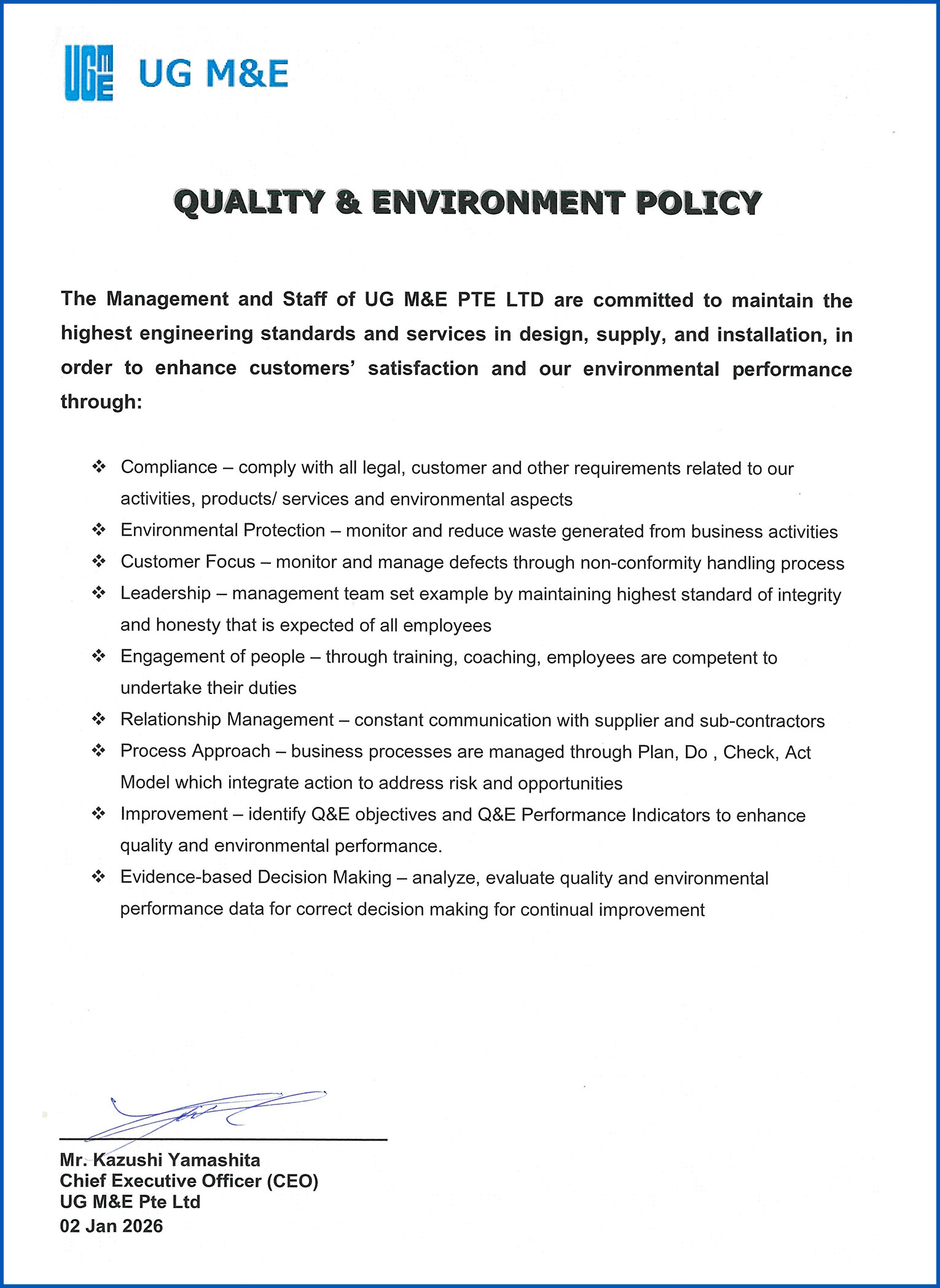 As an established company, UG M&E focuses on continual improvement on quality control, Environmental management and Safety & Health management. Our work is supported by comprehensive management systems which meet International Standard including: ISO 9001, ISO 14001 and ISO 45001.